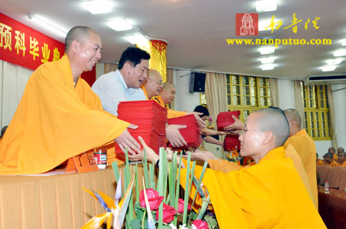 又是一年凤凰花开、荷塘欢畅的季节。2009年6月8日,闽南佛学院迎来了第十一届本科暨第五届预科毕业典礼。全国人大代表、中国佛教协会副会长、闽南佛学院院长圣辉大和尚,厦门市民宗局陈建德书记、蔡永华副局长、黄镇辉处长,厦门市佛教协会会长、南普陀寺方丈则悟大和尚,闽院常务副院长界象法师、副院长法源法师,太虚图书馆馆长了法法师、研究生导师济群法师,南普陀慈善会常务副会长慧然法师,闽院院长助理兼教务长传明法师、院长助理兼办公室主任净心法师、教导长达源法师等闽院各部门领导以及任课法师老师和全体学僧在南普陀寺讲堂出席了毕业典礼。 上午9时,主持人界象法师宣布毕业典礼开始的话音一落,雄壮的国歌声马上响起。与会人员齐心诵经完毕,院长圣辉大和尚发表了苦口婆心的讲话。大和尚首先向毕业僧们圆满学业表示热烈的祝贺和赞叹,向辛勤教学的法师老师表示崇高的敬意,向一贯支持闽院办学的厦门市委市政府和市民宗局表示衷心的感谢。之后,院长大和尚对毕业僧提出五点要求;一、谨记爱国爱教的优良传统;二、虚心好学,做到难学能学、难行能行;三、立志成为佛门龙象,要有吃苦耐劳的牛马精神;四、系念母校;五、常怀感恩之心,维护佛教健康发展,将佛教发扬光大。大和尚诚恳地希望各位毕业后在各个佛教岗位上,严格要求自己,不断完善人格、僧格和国格,做到“讲因果、讲持戒、讲修行”的基本信仰要求。 则悟大和尚代表厦门市佛教协会在典礼上致辞,他追述了闽院的创办历史和僧才辈出的灿烂教育成果,列举了和闽院有着很深渊源的近现代高僧大德为国为教的弘法事迹作为毕业僧们的学习榜样,鼓励他们要为中国佛教事业贡献力量和心智。 陈建德书记在讲话中指出,大家离开闽院之后,要一如既往弘扬爱国精神、实践人生佛教的思想,为社会和谐、人民安乐做贡献;勇于承担社会责任、积极进取、认真工作;同时,作为母校闽院,也要继续关注毕业僧离校后的健康成长。 在主席台上就坐的各位领导法师为毕业僧颁发毕业证书后,全体毕业僧起立致发愿词,另有法师代表、在校学僧代表、毕业僧代表先后致辞。 11时许,毕业典礼在庄严的三宝歌声中圆满结束。