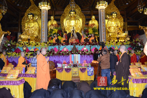 2014年12月6日上午10时许,南普陀寺内钟鼓齐鸣,梵音缭绕,则悟方丈在仪仗队及诸斋主的至诚迎请下,移步大雄宝殿持杖说法,福庇有情。 今有水陆法会总会首、护法檀那吴友华合家、陈山琼合家,以及陈惠英、陈剑、陈彤、张琳、陈芃亦居士等敬设上堂大斋一堂供佛及僧。伏愿以此供佛斋僧功德,回向风调雨顺,国泰民安,世界和平,正法久住。 10时50分,与会诸功德主随大坛法师分别至延寿坛、往生坛念佛回向。惟愿各氏门中、各人堂上,现在者常随佛学,增福延寿;过去者往生净土,悉得解脱。 11时30分,诸斋主于五观堂虔诚礼谢,行十方礼;众僧欢喜应供,如法受食。 一、供上堂斋