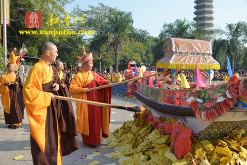 2015年12月2日,农历十月二十一日,厦门南普陀寺历时七天的“乙未年法界圣凡水陆空普度大斋胜会”功德圆满,隆重举行了壮观盛大的送圣仪式。礼请南普陀寺方丈则悟大和尚、首座了法法师、首座兼监院界象法师、副寺兼维那圆满法师以及本次水陆法会副表闻谛法师主法,与会僧俗大众、护法居士、义工近四千人共赴道场,同沾法喜。 下午13时30分,南普陀寺内人山人海,诸功德主、护法居士齐聚内坛参加送圣仪式。是时,寺内钟鼓齐鸣,铜锣开道,则悟大和尚等主法法师率四众弟子奉请圣驾,念佛引导,齐心恭送圣众请登云路,六道凡众往生极乐净土。送圣队伍浩浩荡荡,宛若长龙,绕寺一匝后至送圣地点,众僧排班列队于镇坛大将军两侧,齐诵佛号,并将上下堂疏楮、二十四席牌位及受荐亡灵牌位次序同置于西方船内,则悟大和尚点燃西方船,为整场法会画上了圆满的句号。 最后,则悟大和尚为大众开示说:“这次水陆大斋胜会,在三宝的加被下,大家的身心得到洗礼,至此得以圆满结束,但法会的精神依旧存在,大家应当将这种精神运用到生活、工作、家庭中,无论在何处都要拥有慈悲之心,广结善缘,积善得福,这是最好的修行。希望大家恭敬三宝,福慧双修,实践水陆法会的精神,在今后的修行道路上能够领悟更多的法义。在此感谢所有的信众来护持道场,感谢所有的法师、所有的义工菩萨们、所有的参与人员;同时,感谢所有的媒体工作者,期待明年水陆法会在此相聚。