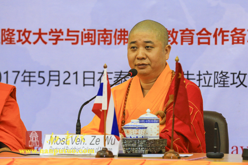 千年佛缘,百年盛世。为了发挥佛教在“一带一路”进程中的文化纽带作用,推动中泰两国佛教教育事业的共同发展,进一步加强南北传佛教的友好交流,2017年5月21日,中国厦门闽南佛学院与泰国摩诃朱拉隆功大学教育合作备忘录签署仪式暨闽南佛学院校友会泰国分会授牌仪式在泰国摩诃朱拉隆功大学新校区隆重举行。中国佛教协会副会长、厦门市佛教协会会长、厦门南普陀寺方丈、闽南佛学院院长则悟大和尚带领中国福建省厦门市佛教协会暨闽南佛学院第十五届本科毕业班“重走海上丝绸之路”交流参访团一行138人,与泰国摩诃朱拉隆功大学副校长沙威长老及校领导、部分师生,共同见证了这一神圣而庄严的时刻。 曼谷当地时间上午9时许,参访团一行乘车抵达摩诃朱拉隆功大学。在炎炎烈日下,沙威长老已等候则悟大和尚一行多时。礼堂前,老友相见,格外亲切,互致问候后拾阶而上,共同来到佛前席地而坐,诵经祈福,吉祥殊胜。在泰国留学的闽院毕业生还为则悟院长献上美丽的鲜花,感恩母校,感恩师长的谆谆教诲。两所院校,法谊深厚,十余年来,双方除了不定期的交流互访外,也互派留学生学修,现有闽院毕业生寂慧法师和证宏法师作为学院遣派留学生在朱大就读。 上午10时30分,闽南佛学院与泰国摩诃朱拉隆功大学教育合作备忘录签署仪式暨闽南佛学院校友会泰国分会授牌仪式正式举行。中泰大德法师共同回顾了中泰佛教的法谊,一致认为此次合作交流意义重大,是新时期南北传佛教交流的重大进展。 沙威长老在讲话中表示:今天,是我们摩诃朱拉隆功大学幸运的一天,能够欢迎到最尊敬的则悟大和尚所带领的交流团,代表中国厦门市佛教协会、南普陀寺、闽南佛学院,这是很稀有的事情,所以我们觉得很幸运。正值我们大学进行毕业典礼,来自世界各地的学生,都来到我们学校里接受他们应得的学位,前来接受学位的学生一共有6000人,典礼持续两天;其中一个学生,苏达博士,曾于2005年在闽南佛学院女众部留学。今天是重要的日子,闽南佛学院和摩诃朱拉隆功大学这两所学校将进行前所未有的合作交流,今后将在交流合作中不断地深入探索与实践。 则悟大和尚致辞说:“摩诃朱拉隆功大学闻名国际,是泰国最古老和最重要的大学之一,在佛教教育、弘法布教等方面有着丰富的经验。闽南佛学院历史悠久、历代高僧辈出,一直以来都是汉传佛教僧才教育和输送的重镇。自2004年以来,在圣辉大和尚的推动下,在梵志校长和沙威副校长的支持下,我们双方就建立了友好交流合作的法缘和法谊。多年来,闽南佛学院已有不少学僧赴泰国留学深造,弘法交流。今天,终于再一次迎来了合作交流的顺利开展,这是南北传佛教交流互动的殊胜因缘,这将对闽南佛学院培养大批高素质、符合时代要求、具有国际视野的新型佛教人才大有裨益。在此,我谨代表闽南佛学院衷心地感谢摩诃朱拉隆功大学,感谢梵志校长和沙威副校长的大力支持。祝愿摩诃朱拉隆功大学海众安和,教育事业兴隆;梵志校长、沙威副校长法体安康,法音远布;与会大德法师六时吉祥!” 随后,沙威长老和则悟大和尚分别代表各自的院校,签署了教育合作备忘录,在中泰两国佛教教育史上写下了灿烂的篇章,为南北传佛教教育事业铸造了又一座不朽的历史丰碑。 接着,由净心法师主持举行了闽南佛学院校友会泰国分会成立暨授牌仪式。闽南佛学院校友会会长则悟大和尚宣布闽南佛学院校友会泰国分会正式成立并授牌,礼请沙威长老为顾问,任命乾净法师(闽院第八届学僧)为分会会长、任命证宏法师(闽院十一届学僧)为分会代表并颁发证书。 厦门市佛教协会常务副会长定恒法师、副会长法云法师、副会长世澄法师,闽南佛学院常务副院长界象法师、副院长兼教导长净心法师、院长助理弘来法师、办公室主任界淞法师、国际部筹委会主任祖光法师、副教导长超波法师等出席仪式。近年来,闽南佛学院积极参与佛教的海外丝路建设,与泰国方面就教育、文化、建筑、管理等内容进行友好交流,取得了密切联系、加强友谊、取长补短等成效。 一、参观泰国摩诃朱拉隆功大学