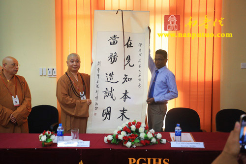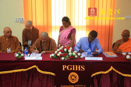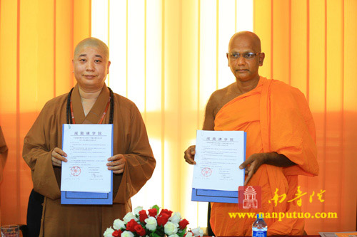为更好的服务国家“一带一路”战略,加强对外交流,增进中斯佛教法谊,推动南北传佛教教育事业的发展,共谱僧伽教育办学的新篇章,2017年5月24日,中国厦门闽南佛学院与斯里兰卡佩拉德尼亚大学教育合作备忘录签署仪式暨闽南佛学院校友会斯里兰卡分会授牌仪式在斯里兰卡佩拉德尼亚大学隆重举行。中国佛教协会副会长、厦门市佛教协会会长、厦门南普陀寺方丈、闽南佛学院院长则悟大和尚带领厦门市佛教协会暨闽南佛学院第十五届本科毕业班“重走海上丝绸之路”交流参访团一行138人,与佩拉德尼亚大学J.M.A.加亚维格玛教授、智难陀(Ven.Prof.M.Gnanananda)教授以及佩拉德尼亚大学佛学系师生共同见证了这一振奋人心的历史时刻。 康提当地时间上午9时许,参访团一行乘车抵达校园环境优美、景色怡人的佩拉德尼亚大学。这所大学创建于1942年,是斯里兰卡国家知名的大学,因此吸引了来自中国等世界各地的僧人来此修学深造。近年来,闽南佛学院前来进修的毕业僧日趋渐多,目前有法隆法师(闽院第九届)、道心法师(闽院第十三届)正在佩拉德尼亚大学就读。 首先,与会大德法师燃灯祈福,为中斯佛教友好合作拉开吉祥的序幕。接着,佩拉德尼亚大学人文与社会科学院院长J.M.A.加亚维格玛教授致欢迎辞,并介绍了与闽院签署教育合作事宜的缘起,表示能与中国佛教高等院校之一的闽南佛学院合作,非常开心,也很难得,希望在今后的合作中,我们能够为南北传佛教教育事业培养出更多的优秀人才。 则悟大和尚致辞说:“首先,我们要感恩三宝的加持,感恩佩拉德尼亚大学盛情的邀请,让我们有机会来到斯里兰卡这个佛教兴盛的国家。为了促成此次参访及交流合作事宜,双方代表经过多方面的努力与协调,才成就了今天的盛况,让我们以热烈的掌声,向他们致以由衷的感谢!今天,闽南佛学院与佩拉德尼亚大学交流合作,不仅仅是签约合作,也是推动国际僧伽教育新进展的里程碑。未来我们仍将继承和发扬大德先贤不远万里弘法求法的精神,促进和平稳定、和谐共生、和睦共处、开放包容的多元文化环境,培养具有国际视野、契合时代人心的中青年僧才。祈愿两校交流合作圆满成功;祈愿佩拉德尼亚大学成就更多功德庄严,全校师生法体康泰,六时吉祥。” 随后,则悟大和尚和加亚维格玛院长分别代表各自的院校签署了教育合作备忘录,为增进中斯佛教法谊,推动南北传佛教教育事业的发展,共同开启了僧伽教育多元化、国际化办学的新篇章。 接着,由闽院副院长兼教导长净心法师主持举行了闽南佛学院校友会斯里兰卡分会成立暨授牌仪式。闽南佛学院校友会会长则悟大和尚郑重宣布闽南佛学院校友会斯里兰卡分会正式成立并授牌,任命祖光法师(闽院第六届学僧)为分会会长、任命法隆法师(闽院九届学僧)为分会代表并颁发证书。祖光法师和乾净法师(闽院校友会泰国分会会长)先后致辞,表达了对母校的感恩之情,并发愿为凝聚校友力量、发扬母校悲智精神、传承佛法真谛作出应有的贡献。 多年来,闽南佛学院在教学上“八宗并重,五明兼顾”,学习古圣先贤在丝绸之路不畏艰难险阻的精神,为减少地域局限、拓展教育视野、创新教学方式、增加文化交流、强化法脉传承,积极努力地搭建海外学习交流平台。誓愿将慈悲与和平弘传深远,把智慧与和谐传递十方。 厦门市佛教协会常务副会长定恒法师、副会长法云法师、副会长世澄法师,闽南佛学院常务副院长界象法师、副院长兼教导长净心法师、院长助理弘来法师、办公室主任界淞法师、国际部筹委会主任祖光法师、副教导长超波法师等出席仪式。 一、教育合作备忘录签署仪式