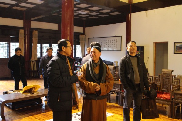 2014年02月08日下午3点左右,全国著名书画家王福元先生和周伟忠先生等一行人,来雁荡山能仁寺拜访了法大和尚。书画家王福元先生在了法大和尚的书房挥毫泼墨,题写“能仁好茶 了法谈禅”书法作品,赠送给雁荡山能仁寺方丈了法大和尚,书画家周伟忠先生带来了最得意的墨宝赠送给了法大和尚,为了感谢两位书画家的厚爱,了法大和尚也备有薄礼,赠送由人民美术出版社出版发行的《释了法绘画·书法集》给两位书画家。随后一行人在雁荡山能仁寺方丈寮茶叙,座谈中王福元先生对大和尚的一副达摩祖师画像非常感兴趣,赞叹了法大和尚的深厚画工,并用随身携带的数码相机拍摄下来,一备以后临摹作画。周伟忠先生则对根雕作品很感兴趣,和大和尚谈论根雕方面的技巧等;同行中西安市温州商会的文化顾问兼书画经纪人何河清先生,对方丈寮供台上的国家非物质文化遗产黄杨木雕弥勒佛饶有兴趣,得知了法大和尚在出家前专门从事黄杨木雕这项技艺,并有多个黄杨木雕作品、且为当时多个寺院雕制或修复黄杨木雕的佛菩萨形像等,兴致高涨的向了法大和尚请教黄杨木雕方面的创作经验。随后了法大和尚亲自带领诸位贵宾参观了雁荡山能仁寺和竺摩纪念馆,在竺摩纪念馆了法大和尚为来访人员们讲解了竺摩法师弘法的一生,并特别介绍了竺摩法师在书法、绘画和篆刻上面的艺术造诣。时间匆匆下午5点左右,了法大和尚在能仁寺山门口送一行人离开,一行人依依不舍的向了法大和尚道别,并表示下次再来拜访大和尚,同时欢迎了法大和尚去他们的寓所交流。