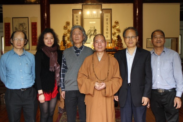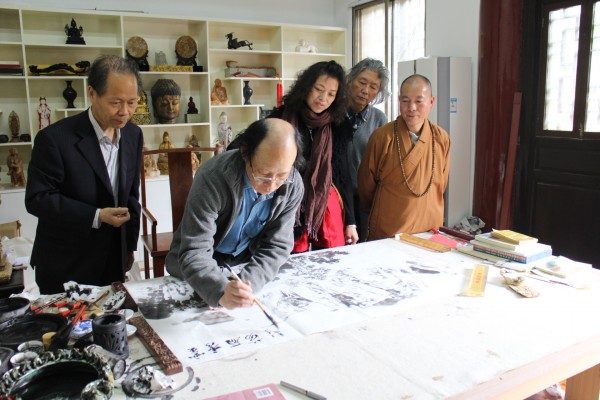 2014年4月13日下午一点,上海文史研究馆原馆长、上海炎黄文化研究会副会长吴孟庆先生、海上水墨画院、中国山水画家执行院长赵家宁先进、上海水乡书画院院长周逸范先生、上海水乡书画院办公室主任赵洁等一行,到温州雁荡山能仁寺拜访了法大利尚,能仁寺方丈了法大和尚在方丈楼热情接待来访客人。吴孟庆先生在品茶之余,顺手写了一副对联:雁荡生灵秀,古刹有能仁。周逸范先生、赵家宁先生、赵洁女士还为能仁寺作画,主客们还各赠送礼品。