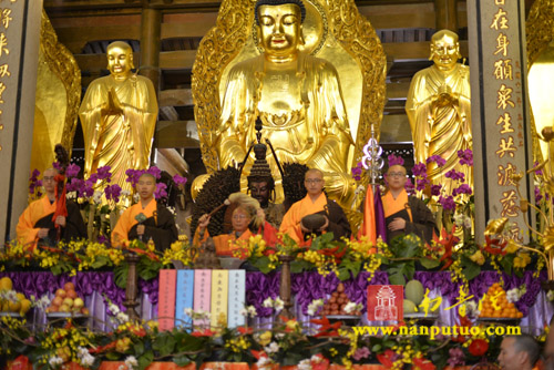 2015年11月28日,南普陀寺水陆胜会第三日,法会众功德主虔发菩提之心,敬设上堂大斋供佛斋僧。南普陀寺首座了法法师在众功德主迎请下,移步大坛为法会拈香主法,升座说法,广度有情。